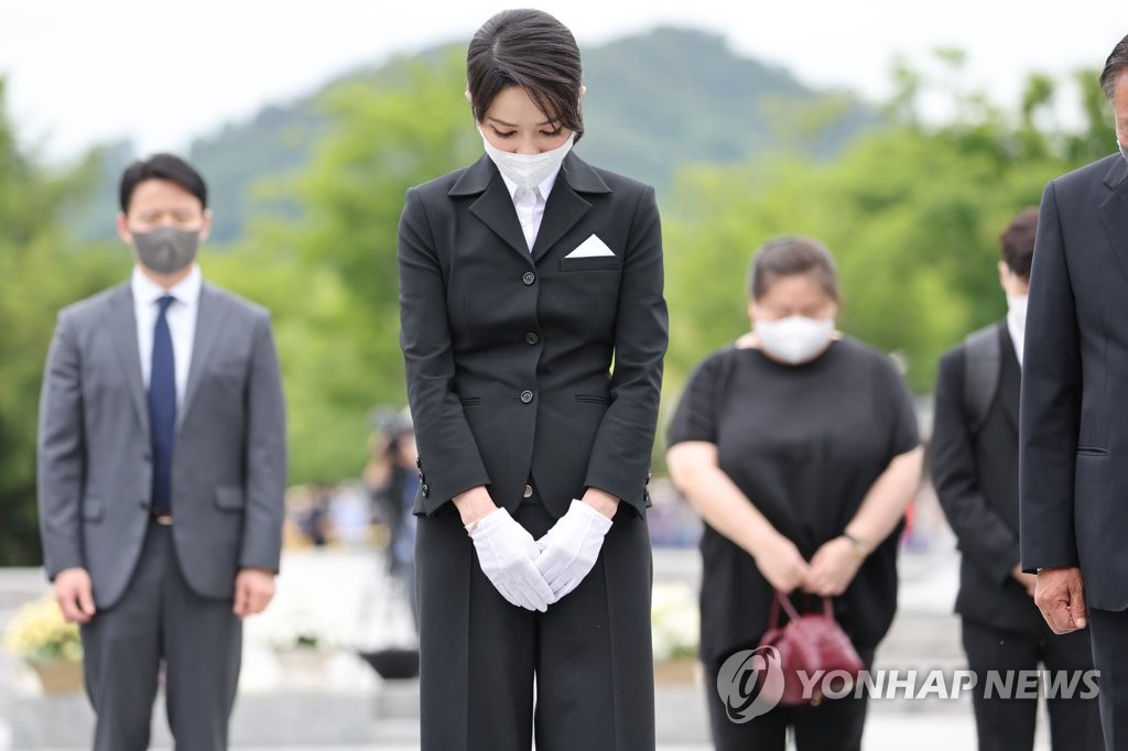 SEOUL, June 13 (Yonhap) -- First lady Kim Keon-hee paid a visit to the widow of former President Roh Moo-hyun at her home in the southeastern village of Bongha on Monday.