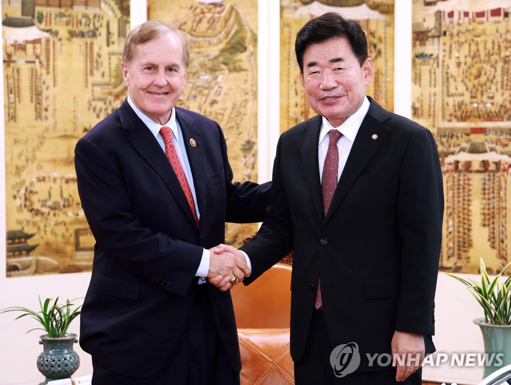 | ▲ National Assembly Speaker Kim Jin-pyo (R) poses for a photo with Robert Pittenger, head of the Parliamentary Intelligence-Security Forum, at the assembly complex in Seoul on Sept. 7, 2022, in this photo provided by Kim's office. (PHOTO NOT FOR SALE) (Yonhap) |