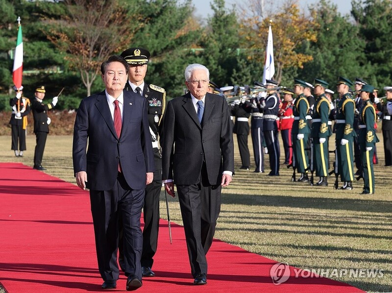 | ▲ President Yoon Suk Yeol (L) and his Italian counterpart, Sergio Mattarella, inspect an honor guard during an official welcoming ceremony at the presidential office compound in Seoul on Nov. 8, 2023. (Yonhap) |