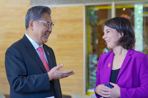 | ▲ South Korean Foreign Minister Park Jin (L) talks with German Foreign Minister Annalena Baerbock in Bali, Indonesia, on July 8, 2022, on the margins of the G-20 meeting, in this photo provided by Park's office. (PHOTO NOT FOR SALE) (Yonhap) |
