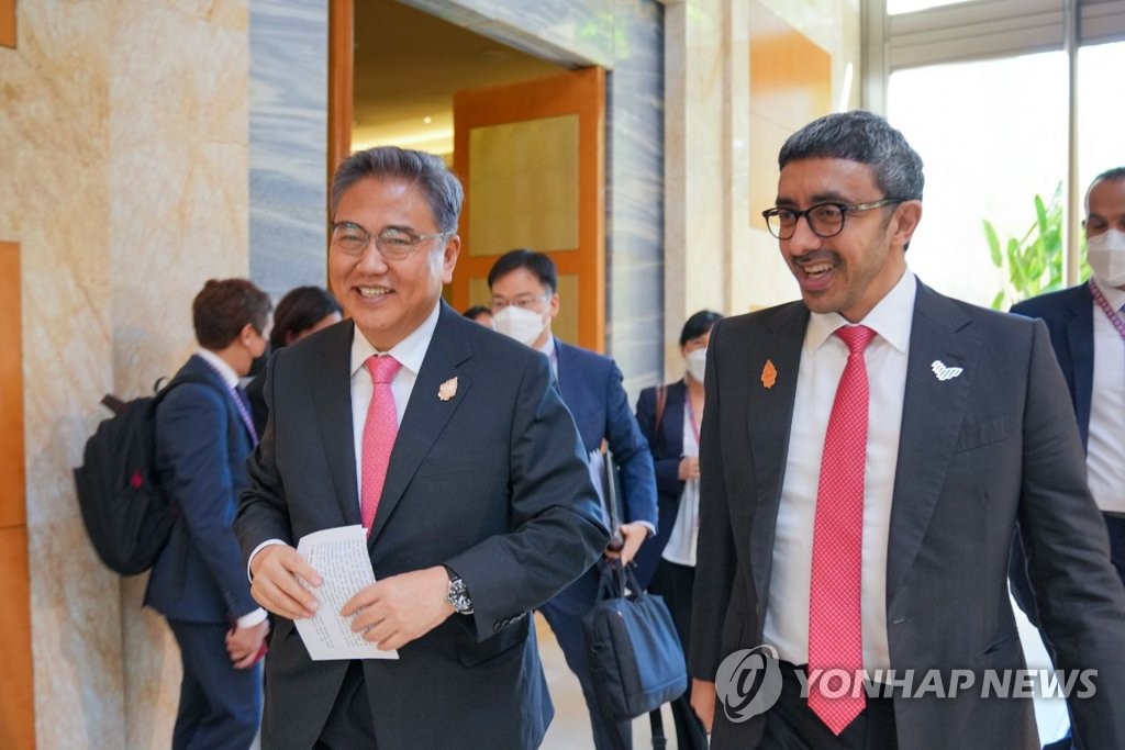 | ▲ South Korean Foreign Minister Park Jin (L) and Sheikh Abdullah bin Zayed Al Nahyan, UAE Minister of Foreign Affairs and International Cooperation, meet in Bali, Indonesia, on July 8, 2022, on the margins of the G-20 meeting, in this photo provided by Park's office. (PHOTO NOT FOR SALE) (Yonhap) |
