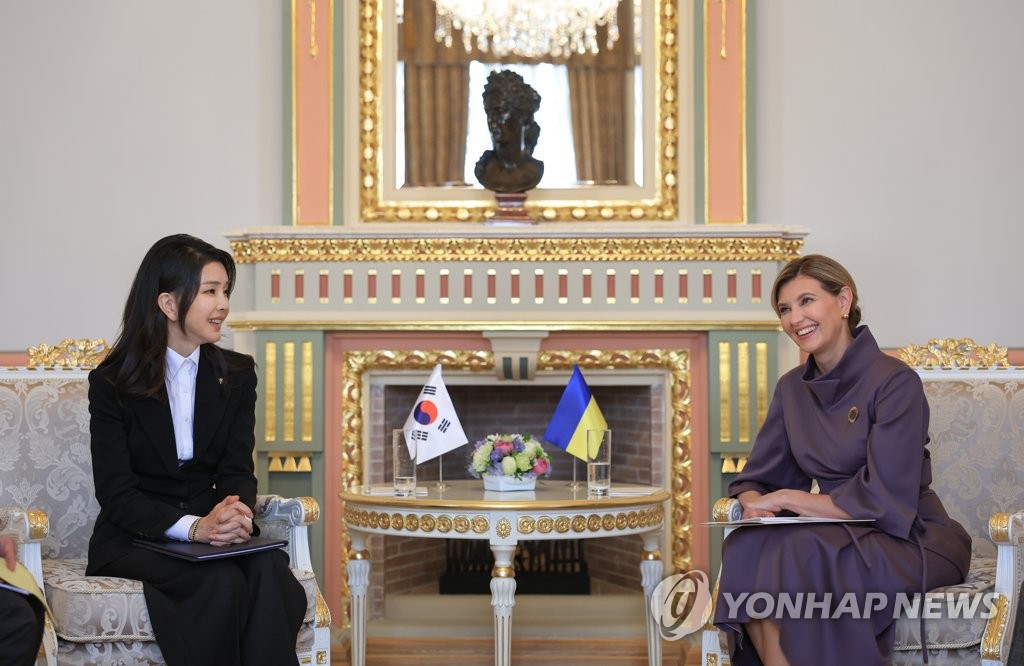 ▲ South Korean first lady Kim Keon Hee (L) and Ukrainian first lady Olena Zelenska meet at the Mariinskyi Palace, the official residence of the president of Ukraine, in Kyiv on July 15, 2023, in this photo provided by South Korea's presidential office. (PHOTO NOT FOR SALE) (Yonhap)