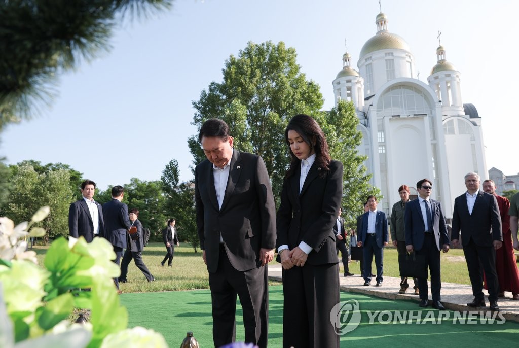 ▲ South Korean President Yoon Suk Yeol (L) and first lady Kim Keon Hee bow their heads in tribute at the grave of a victim of mass killings in Bucha, Ukraine, on July 15, 2023, in this photo provided by the presidential office. (PHOTO NOT FOR SALE) (Yonhap)