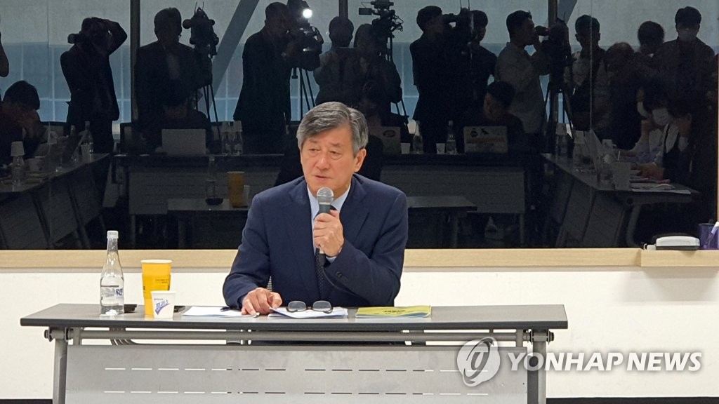| ▲ 이용관 부산국제영화제 이사장 사의 표명 (부산=연합뉴스) 이종민 기자 = 이용관 부산국제영화제 이사장이 15일 오후 부산 해운대구 영화의전당에서 기자간담회를 열고 사의를 표명하고 있다. 이 이사장은 허문영 영화제 집행위원장 사의 표명과 관련해 책임을 지고 이사장직에서 물러나겠다고 밝혔다. 2023.5.15 handbrother@yna.co.kr |