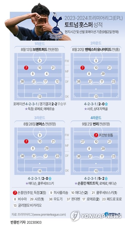 | ▲ [그래픽] 2023-2024 프리미어리그 토트넘 성적 (서울=연합뉴스) 반종빈 기자 = 잉글랜드 프로축구 토트넘의 '캡틴' 손흥민이 프리미어리그(EPL) 개막 4경기 만에 2023-2024시즌 첫 득점포를 가동한 데 이어 해트트릭을 폭발하며 5-2로 팀의 대승을 이끌었다. 손흥민은 2일(현지시간) 영국 잉글랜드 번리의 터프 무어에서 열린 번리와의 2023-2024 EPL 4라운드 원정 경기에서 전반 16분 1-1 동점골 이후 후반 18분과 21분 연이어 골을 넣으며 시즌 첫 해트트릭까지 작성했다. bjbin@yna.co.kr 페이스북 tuney.kr/LeYN1 트위터 @yonhap_graphics |