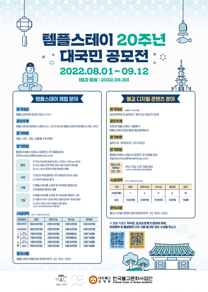 공모전과 관련한 자세한 문의는 템플스테이 체험분야 사무국(☎02-362-3332), 불교 디지털 콘텐츠분야 운영사무국(☎02-853-4323)으로 하면 된다.