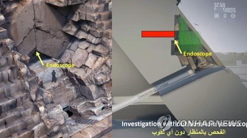 피라미드의 미개척 부분을 고성능 장비로 단층촬영 하는 국제적인 프로그램인 '스캔 피라미드' 프로젝트로 발견했다는 설명입니다.