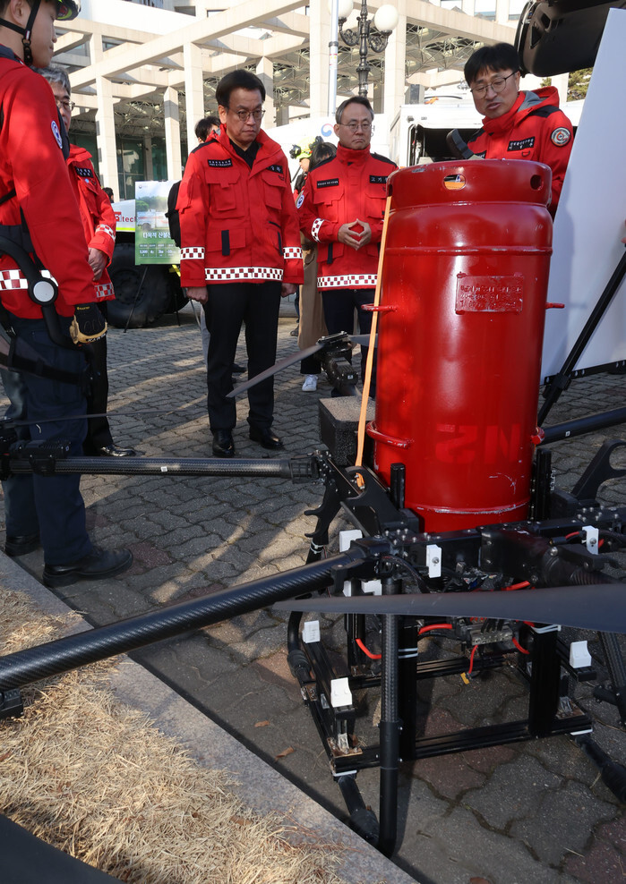 Acting President Choi Sang-mok (C), who concurrently serves as deputy prime minister for economic affairs and finance minister, views equipment for putting out wildfires during his visit to the Central Wildfire Countermeasures Headquarters at the government complex in the central city of Daejeon on Feb. 26, 2025. (Yonhap)