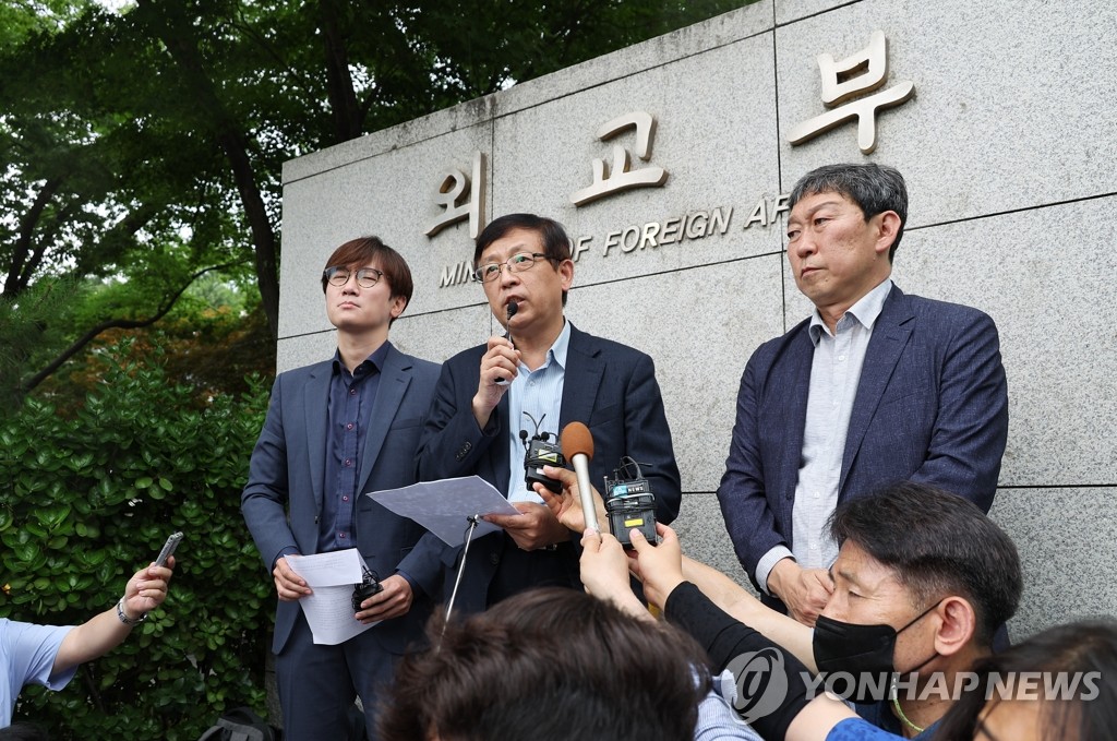 | ▲ Legal representatives of Korean forced labor victims hold a press briefing in front of the main building of the Ministry of Foreign Affairs in Seoul on July 4, 2022, ahead of the first meeting of a consultative body composed of government officials, experts and other stakeholders. (Yonhap) |