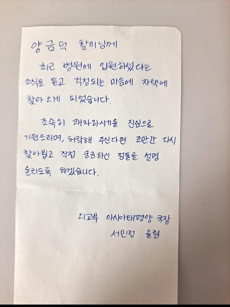 시민모임은 이날 입장문을 내 "외교부 담당 국장과 직원들이 예고 없이 광주에 거주하는 피해자들의 집을 찾아갔으나 만나지 못하고 선물과 쪽지만 남기고 돌아갔다"며 이같이 밝혔다.