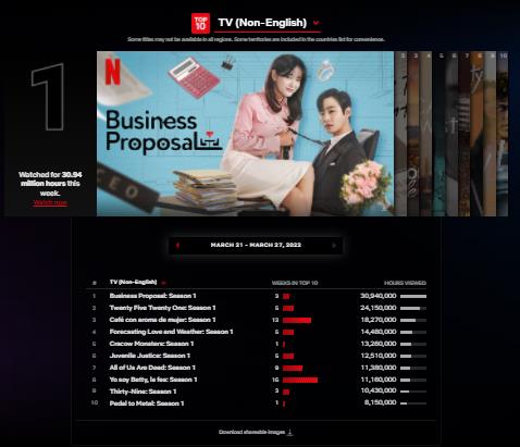 30일 넷플릭스 시청 시간을 공개하는 공식 사이트 '넷플릭스 톱(TOP) 10'에 따르면 '사내맞선'은 3월 넷째 주(21∼27일) 시청 시간 3천940만 시간을 기록해 비영어권 드라마 부문 정상에 올랐다.