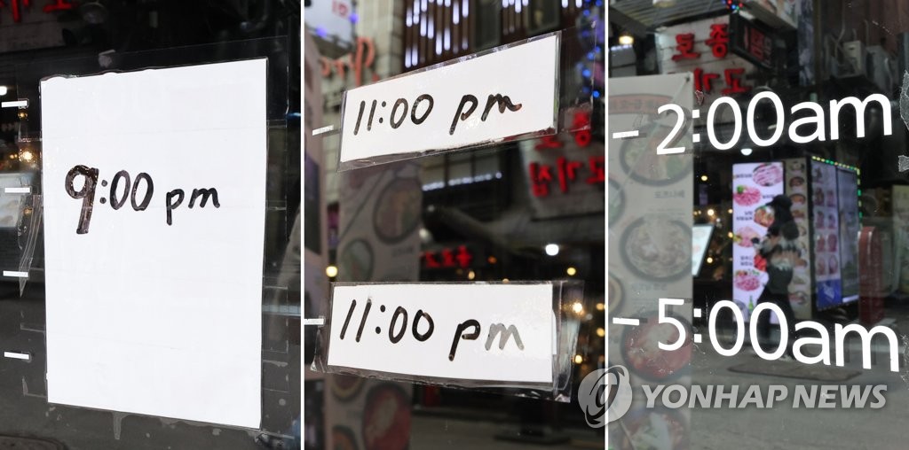 | ▲ 사회적 거리두기의 역사 (서울=연합뉴스) 김주성 기자 = 영업시간 제한, 사적모임 인원 제한 등 '사회적 거리두기' 조치가 모두 해제된 18일 서울 종로구의 한 주점에 영업 종료 시간이 새벽 시간대로 바뀌어 있다(오른쪽). 사진은 영업시간과 사적모임 인원이 각각 6명과 밤 9시로 제한됐던 2월 22일(왼쪽)과 8명과 밤11시로 제한됐던 3월 17(가운데)일 동일 주점이 붙였던 영업시간 안내. 2022.4.18 utzzza@yna.co.kr |