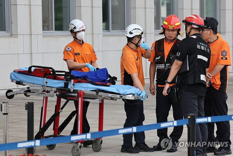 | ▲ Paramedics wheel a stretcher out of the main building of the National Assembly in Seoul on Sept. 17, 2023, after opposition leader Lee Jae-myung, whose health has deteriorated during a hunger strike, refused to be taken to a hospital. (Pool photo) (Yonhap) |
