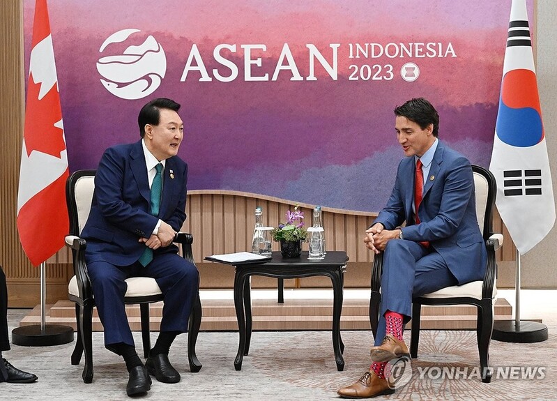 | ▲ South Korean President Yoon Suk Yeol (L) holds talks with Canadian Prime Minister Justin Trudeau at the Jakarta Convention Center in Jakarta on Sept. 6, 2023, on the sidelines of a summit between South Korea and the 10 member nations of the Association of Southeast Asian Nations. (Yonhap) |