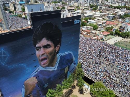 | ▲ "마라도나도 하늘 나라에서 함께 기뻐할 것" (부에노스아이레스 로이터=연합뉴스) 아르헨티나 수도 부에노스아이레스에서 20일(현지시간) 열린 월드컵 우승 축하 퍼레이드 행사장 주변 대형 화면에 36년전인 1986년 멕시코 월드컵에서 아르헨티나 팀을 이끌고 우승을 차지했던 마라도나의 모습이 나오고 있다. 2022.12.20 photo@yna.co.kr |