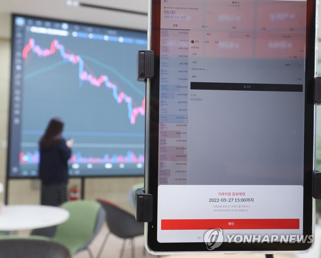 | ▲ A screen at a cryptocurrency exchange in Seoul displays falling values of the Luna coin on May 27. 2022. (Yonhap) |