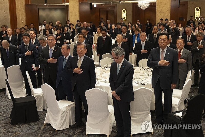 | ▲ Participants salute the flag during a conference co-hosted by the Korea-Japan Friendship Association and the Japan-Korea Friendship Association at a hotel in Seoul on Oct. 13, 2023. (Yonhap) |