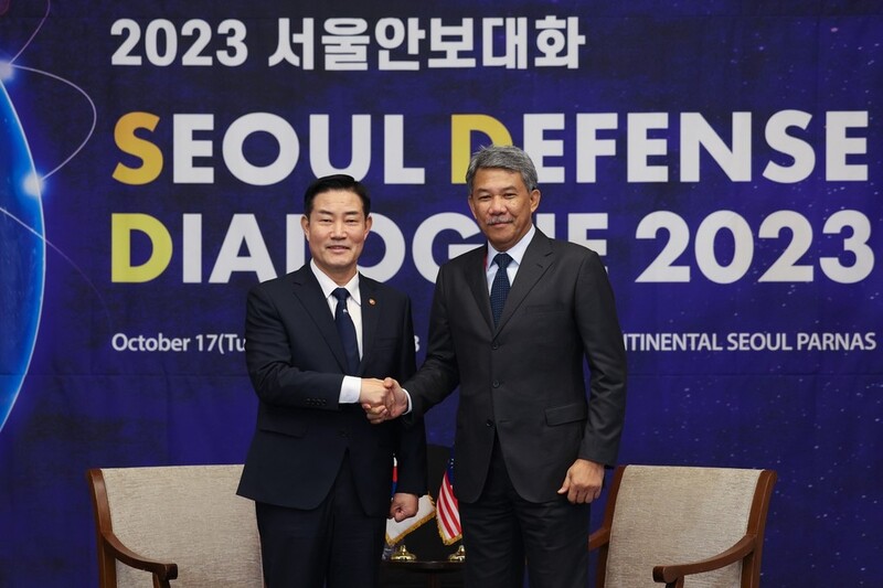 | ▲ Defense Minister Shin Won-sik (L) shakes hands with his Malaysian counterpart, Mohamad bin Hasan, during their meeting on the margins of the Seoul Defense Dialogue at a hotel in southern Seoul on Oct. 18, 2023, in this photo provided by the Defense Daily. (PHOTO NOT FOR SALE) (Yonhap) |
