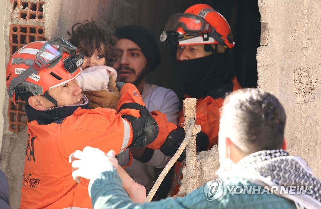 | ▲ This photo provided by the Korea Disaster Relief Team shows South Korean workers rescuing a toddler in Antakya, in the Turkish province of Hatay, on Feb. 9, 2023, after a deadly 7.8 magnitude earthquake hit Turkey and Syria on Feb. 6. (Yonhap) |