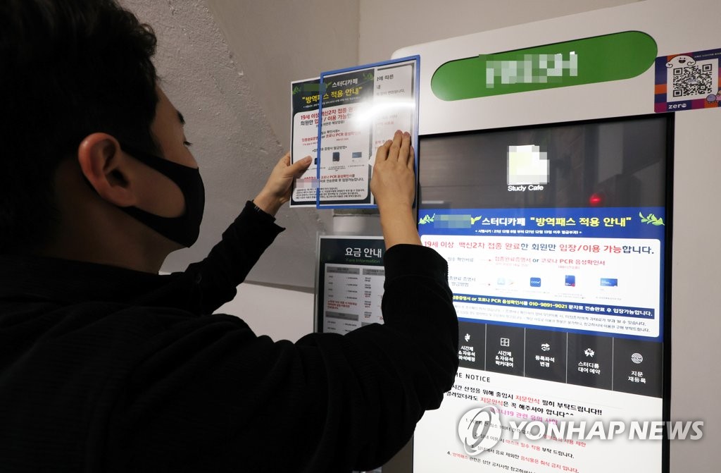 | ▲ 학원·독서실·스터디카페 방역패스 효력 정지 (서울=연합뉴스) 박동주 기자 = 4일 오후 서울 서대문구 신촌 한 스터디카페에서 관계자가 방역패스 안내문을 제거하고 있다. 이날 서울행정법원 행정8부(이종환 부장판사)는 4일 함께하는사교육연합·전국학부모단체연합 등이 보건복지부 장관을 상대로 낸 집행정지(효력정지) 신청을 일부 받아들였다. 2022.1.4 pdj6635@yna.co.kr |