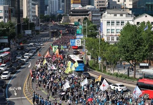 (LEAD) Umbrella union stages massive rallies in Seoul amid scorching heat