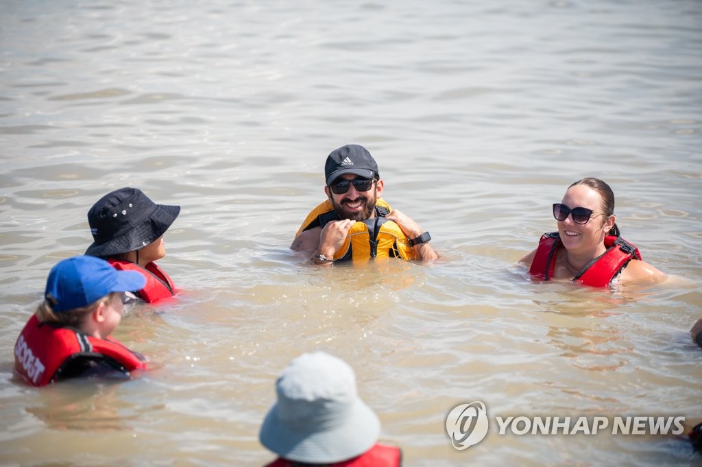 | ▲ This photo, provided by the World Organization of the Scout Movement, shows participants in the World Scout Jamboree cooling down from the heat in a pond at the campsite on the country's southwest coast on Aug. 5, 2023. (PHOTO NOT FOR SALE) (Yonhap) |