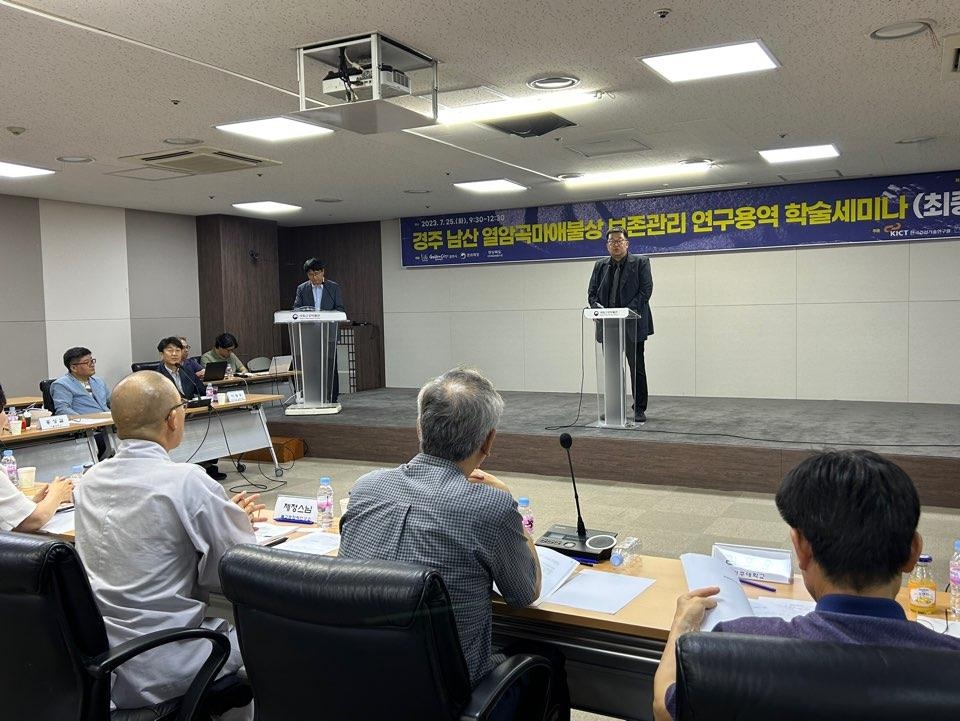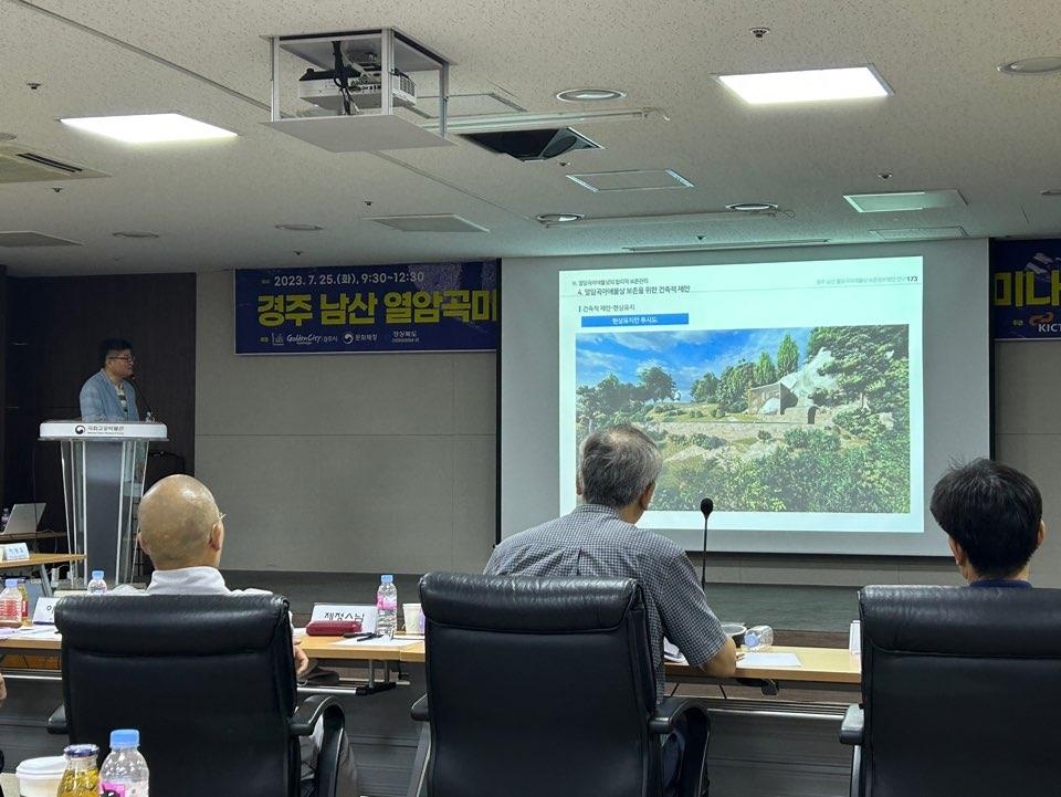 | ▲ 한동수 한양대 건축학부 교수 (서울=연합뉴스) 김예나 기자 = 25일 서울 종로구 국립고궁박물관 강당에서 열린 '경주 남산 열암곡 마애불상 보존관리 연구 용역 학술 세미나'에서 한동수 한양대 건축학부 교수 겸 한국건축역사학회장이 연구 결과를 발표하고 있다. 2023.7.25 yes@yna.co.kr |