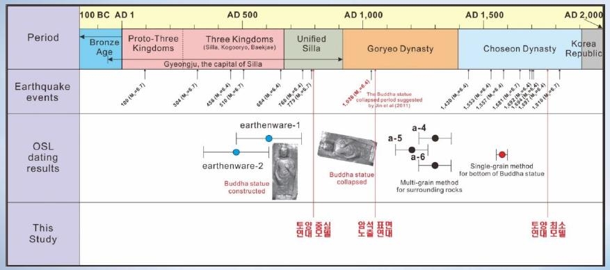 이 연구위원은 "2011년 한 연구에서 제안한 1036년 지진 발생 시기와 유사한 결과"라고 언급하며 "암석에서 나온 자료는 오염이 덜 됐기에 (실제 넘어진 시기와) 근접하지 않을까 싶다"고 말했다.