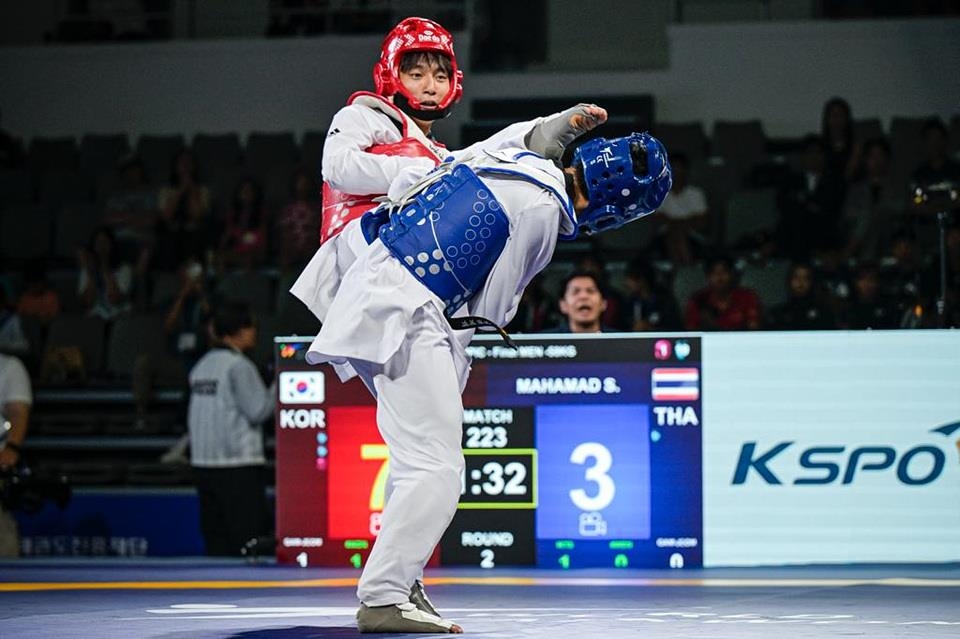 ▲ 발차기 기술 성공하는 김시윤 태권도 기대주 김시윤이 15일 전북 무주 태권도원에서 열린 그랑프리 챌린지 남자 58㎏급 결승에서 태국 마하마드 시라윗의 머리에 발차기 공격을 시도하고 있다. [세계태권도연맹 제공. 재배포 및 DB 금지]
