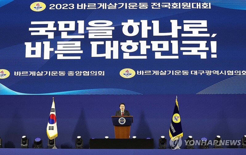 | ▲ President Yoon Suk Yeol delivers congratulatory remarks at a national convention of the Council for the Better Tomorrow Movement in the southeastern city of Daegu on Nov. 7, 2023. (Pool photo) (Yonhap) |