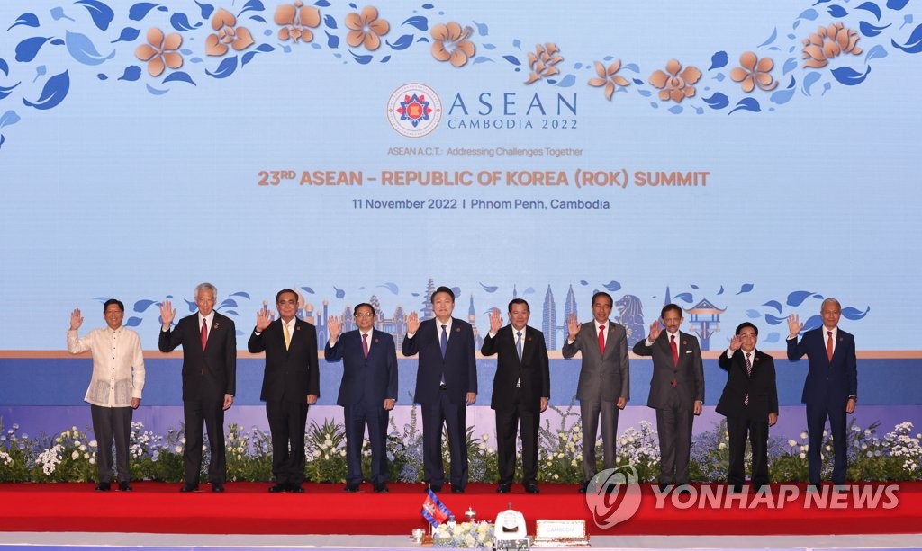 | ▲ President Yoon Suk-yeol (5th from L) and the leaders of the Association of Southeast Asian Nations (ASEAN) pose for a photo during their summit in Phnom Penh on Nov. 11, 2022. (Yonhap) |