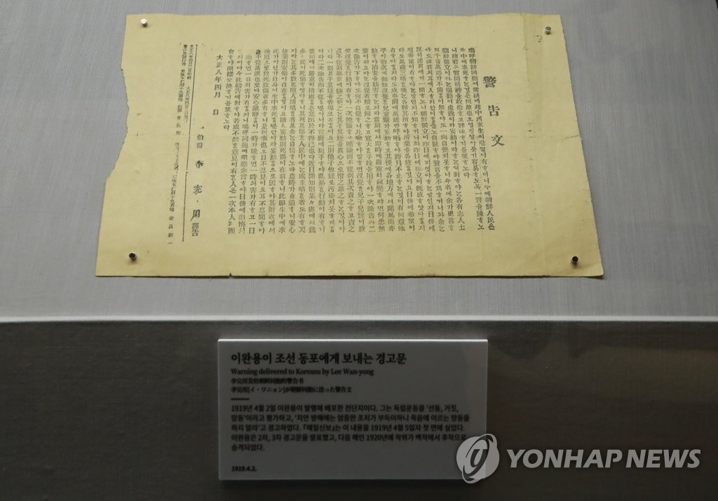 | ▲ 매국의 기록 (서울=연합뉴스) 홍해인 기자 = 21일 서울 종로구 대한민국역사박물관에서 열린 3·1 운동 및 대한민국임시정부 수립 100주년 기념 특별전 '대한독립 그날이 오면' 프레스 투어에서 1919년 4월 2일 이완용이 발행해 배포한 '조선동포에게 보내는 경고문'이 전시돼 있다. 2019.2.21 hihong@yna.co.kr |