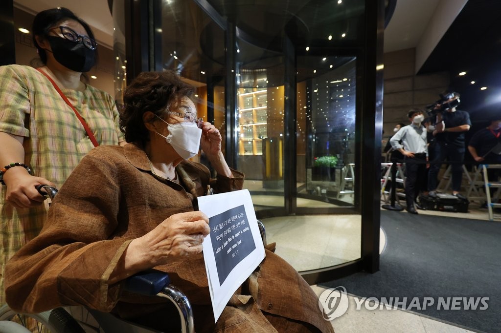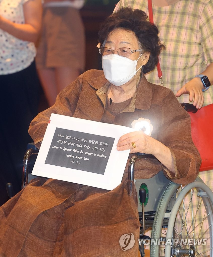 SEOUL, Aug. 4 (Yonhap) -- Lee Yong-soo, a South Korean victim of Japan's wartime military sexual slavery, suffered minor injuries after being pushed off her wheelchair while waiting to meet visiting U.S. House Speaker Nancy Pelosi in Seoul on Thursday.