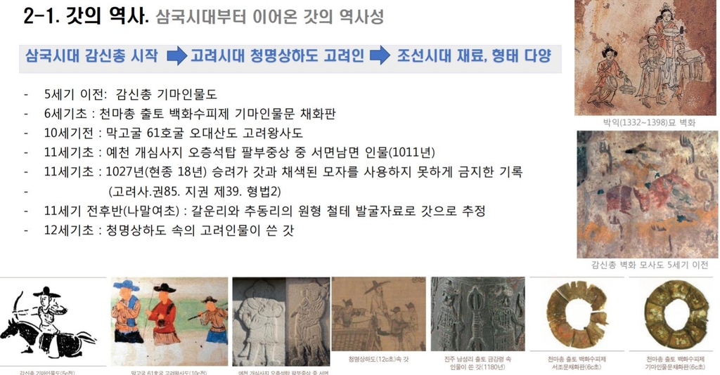 최 연구관은 실물로 남아있는 갓 중 가장 오래된 것은 고려시대 것이지만, 5세기 이전 감신총(고구려) 기마인물도, 6세기초 천마총(신라) 출토 백화수피제 기마인물문 채화판 등에서 갓을 확인할 수 있다고 전했다.