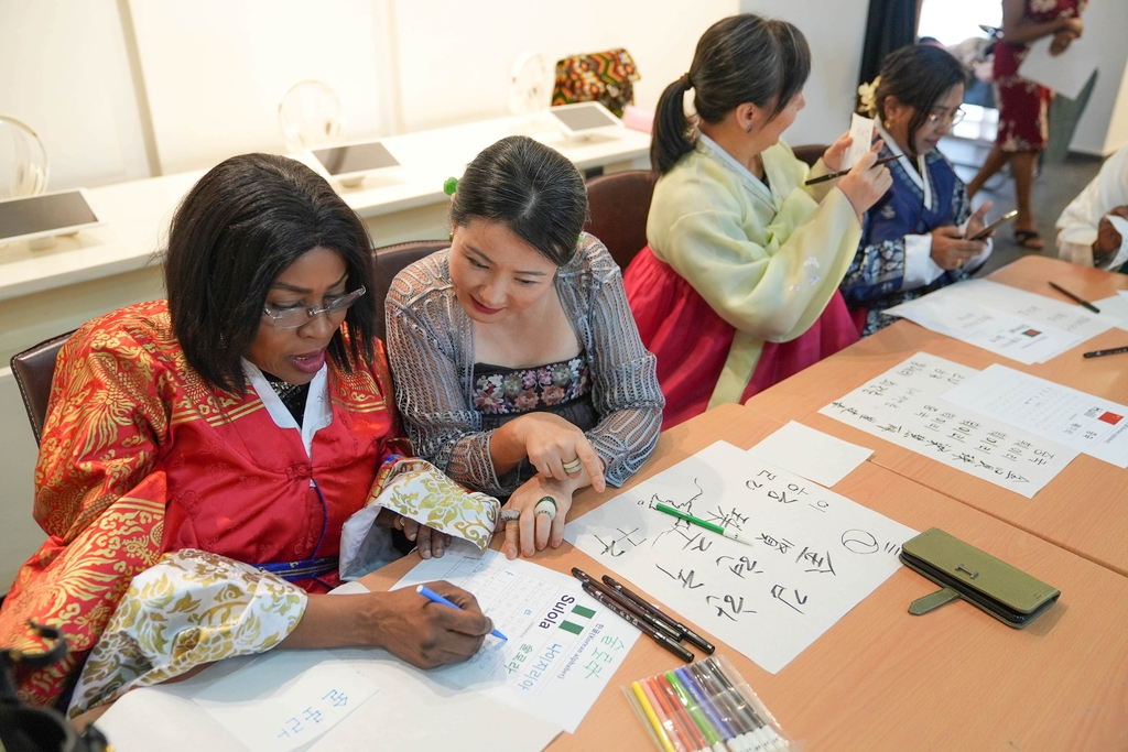 | ▲ 한글 캘리그라피 체험하는 나이지리아 외교부장관 부인(왼쪽) [주나이지리아 한국문화원 제공·재판매 및 DB 금지] |