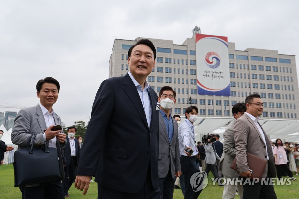 SEOUL, June 19 (Yonhap) -- President Yoon Suk-yeol hosted a "housewarming" event in the front yard of the presidential office in central Seoul on Sunday, inviting some 400 neighbors and others to celebrate the relocation of the office.
