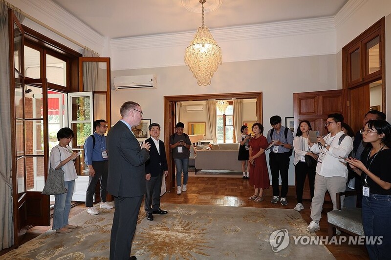 | ▲ Colin Crooks (C), the British ambassador to South Korea, introduces his residence to reporters as part of a preliminary tour on Sept. 11, 2023. (Yonhap) |