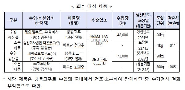 회수 대상은 제이엠푸드 주식회사(충남 공주시), 대림글로벌푸드 주식회사(부산 강서구)에서 수입한 생산년도 2021년, 2022년인 베트남산 고추로, 이들 제품은 각각 농업회사법인 다온푸드(충북 음성군), 주식회사 고추나라(경북 경산시)에서 소분 판매했다.