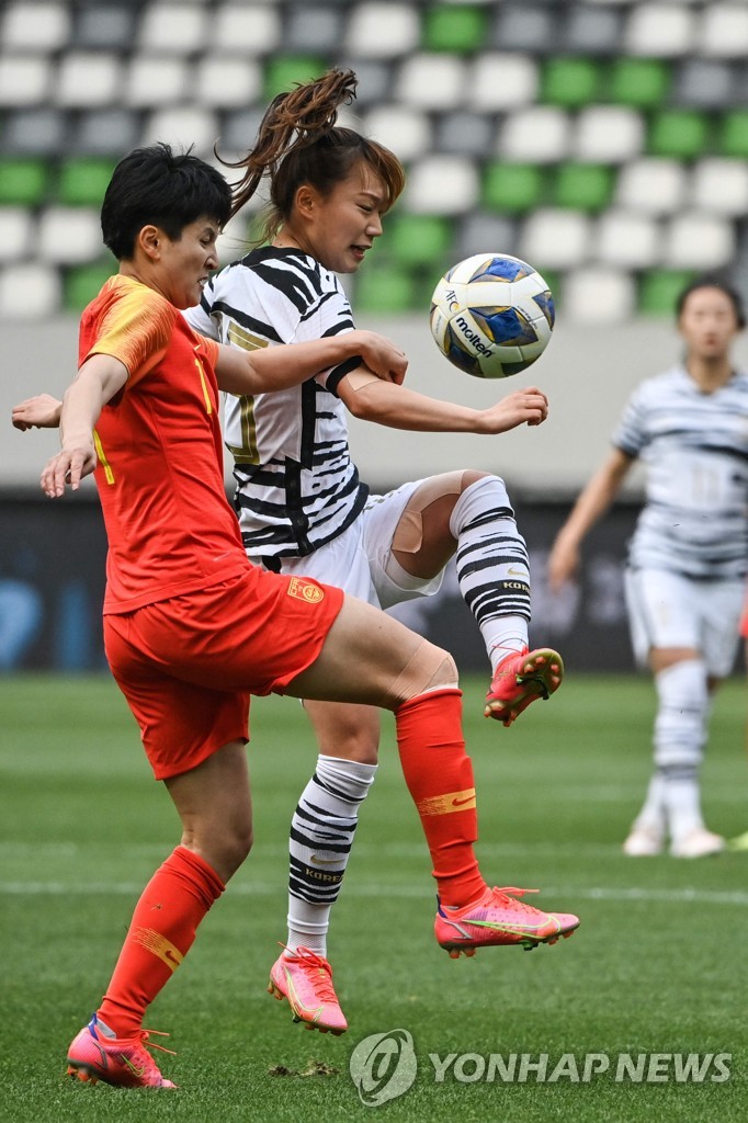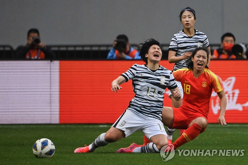 | ▲ In this AFP photo, Lee Geum-min of South Korea (L) collides with Tang Jiali of China during the teams' Olympic women's football qualifying match at Suzhou Olympic Sports Centre in Suzhou, China, on April 13, 2021, in this photo provided by the Korea Football Association. (Yonhap) |