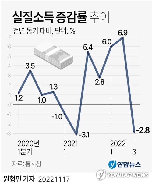 (세종=연합뉴스) 박용주 곽민서 박원희 기자 = 지난 3분기 가계의 명목소득은 늘었지만, 실질 소득은 고물가의 영향으로 13년 만에 최대 폭으로 줄었다.