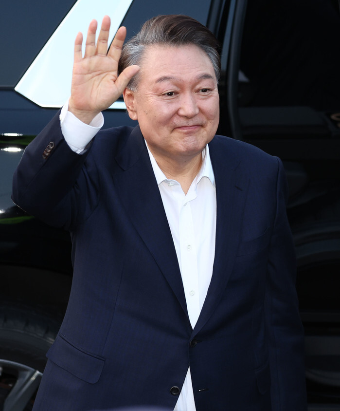 Impeached President Yoon Suk Yeol, released from jail, waves to his supporters in front of his official residence in Seoul on March 8, 2025, following a court's ruling the previous day that allowed him to stand trial without physical detention over his failed bid to impose martial law in December. (Yonhap)