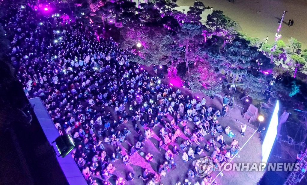 | ▲ People, mostly fans of South Korean boy group BTS, watch a performance in the southeastern port city of Busan on Oct. 14, 2022, one day before BTS was to hold a large-scale concert there in support of the city's bid to host the 2030 World Expo. (Yonhap) |