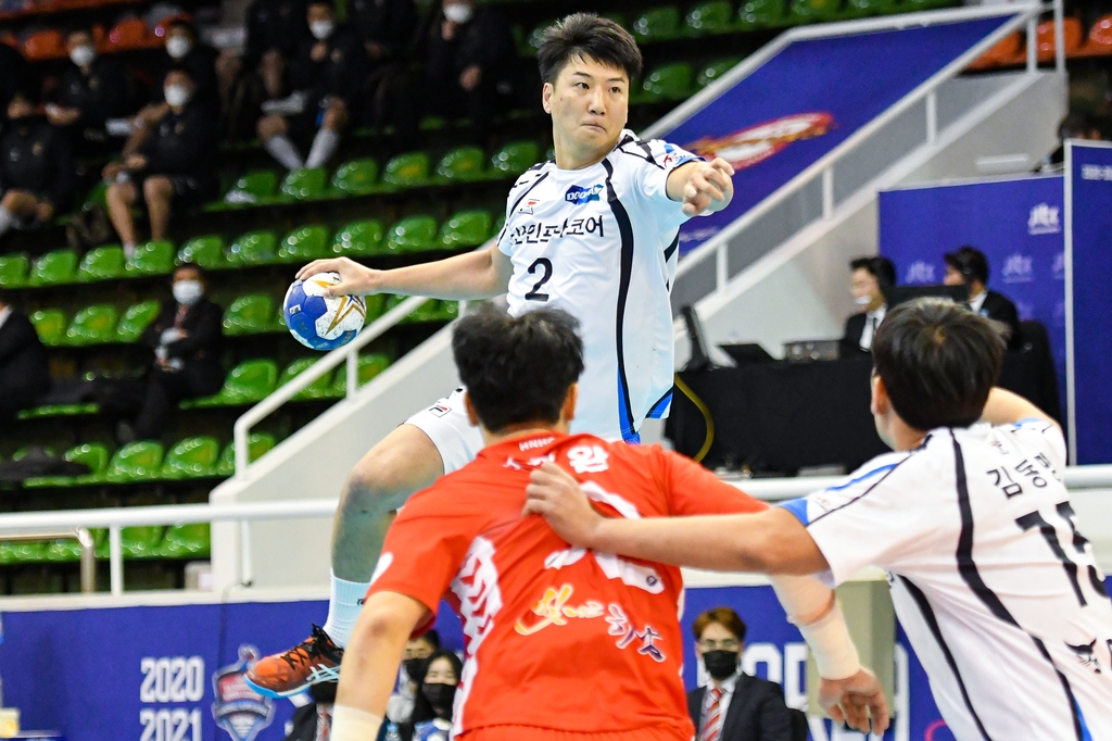 (서울=연합뉴스) 김동찬 기자 = 남자 핸드볼 실업 최강 두산이 2020-2021 SK핸드볼 코리아리그 공동 선두에 올랐다.
