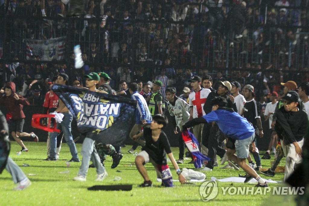 | ▲ In this Reuters photo, Arema FC supporters enter the field after the team they support lost to Persebaya after the league BRI Liga 1 football match at Kanjuruhan Stadium, Malang, East Java province, Indonesia, October 2, 2022. (Yonhap) |