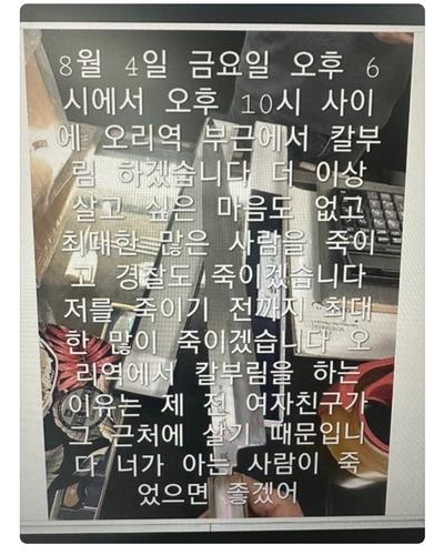 ▲ This image, provided by a reader, shows an internet-circulated threat to "kill as many people as possible" near Ori Station on the evening of Aug. 4, 2023. (PHOTO NOT FOR SALE) (Yonhap)