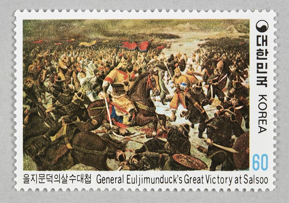 | ▲ 살수대첩 모습을 담은 우표 1982년 6월 15일 발행된 우표로, 을지문덕 장군이 살수에서 수나라 군사들과 전투하는 장면을 묘사한 기록화가 담겨있다. [대한민국역사박물관 제공. 재판매 및 DB 금지] |