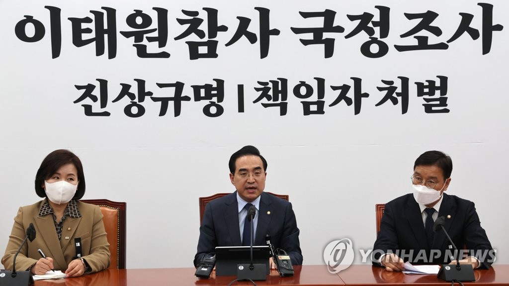 SEOUL, Nov. 9 (Yonhap) -- The main opposition Democratic Party (DP) and two minor progressive parties submitted a joint request Wednesday for a parliamentary investigation into the Itaewon crowd crush despite opposition from the ruling party.