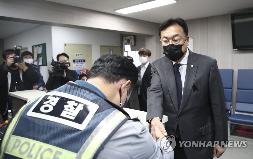 | ▲ Chung Jin-suk (R), the ruling People Power Party interim chief, shakes hands with a police officer during his visit to police precinct in Itaewon, central Seoul, where the deadly crowd crush happened, on Nov. 9, 2022. (Pool photo) (Yonhap) |