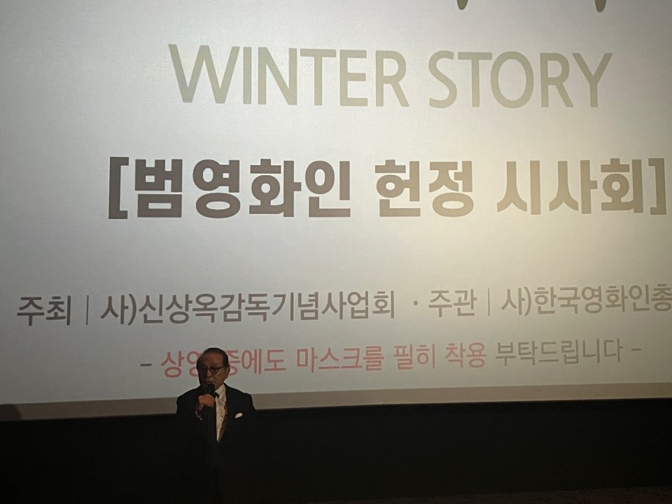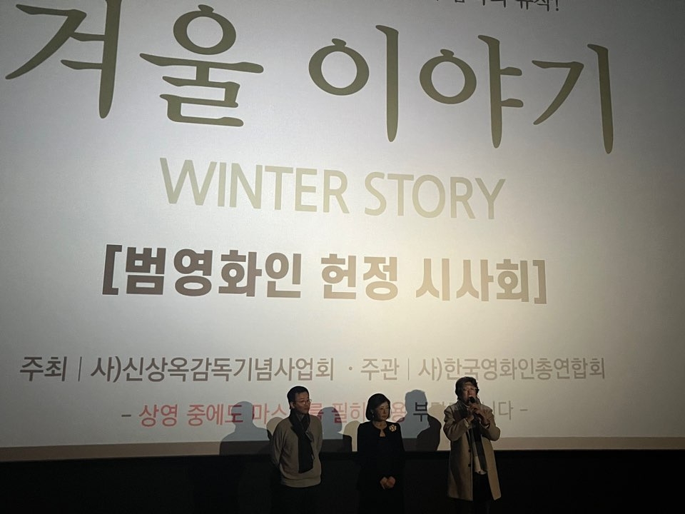 이날 시사회에는 '겨울 이야기' 주연 배우인 김지숙과 조동관 촬영감독, 원로 배우 신영균, 이장호 감독, 양윤호 한국영화인총연합회장, 김홍준 한국영상자료원장 등이 참석했다. 약 200석 규모의 상영관은 고인을 추모하기 위해 모인 영화인들로 가득 찼다.