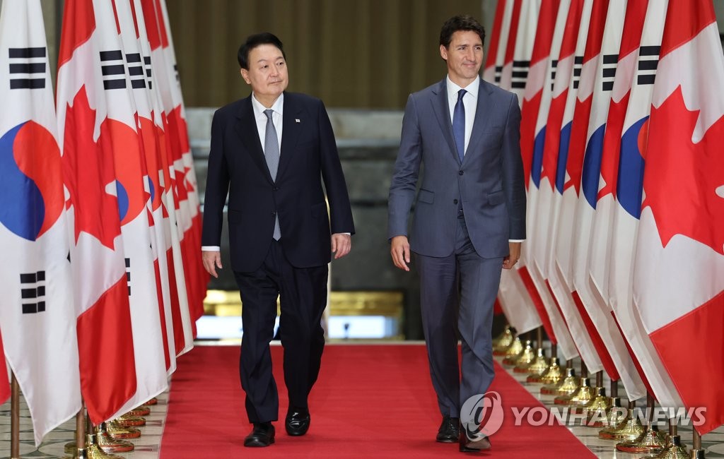 ▲ South Korean President Yoon Suk-yeol (L) and Canadian Prime Minister Justin Trudeau walk to the venue of their joint press conference inside the Sir John A. Macdonald Building in Ottawa on Sept. 23, 2022. (Yonhap)